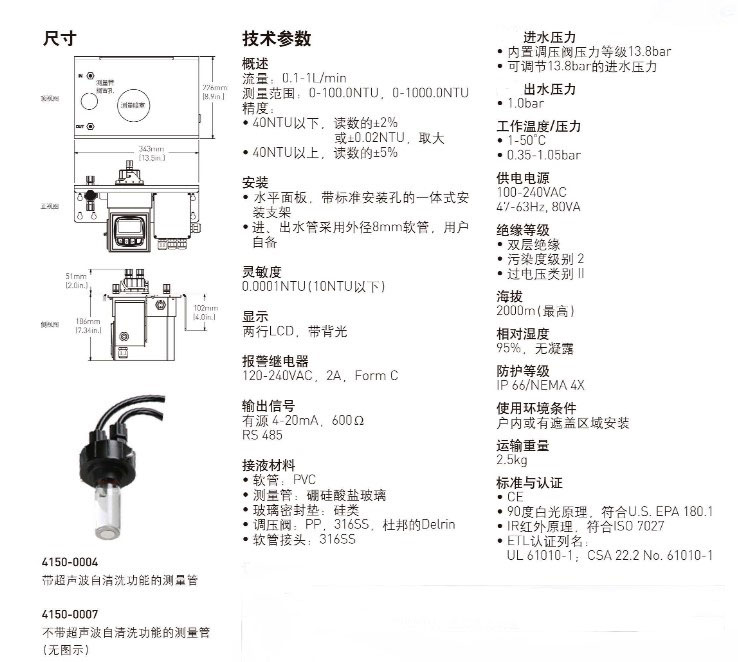 濁度儀3-4150-1 0-1000NTU,無超聲波自清洗功能